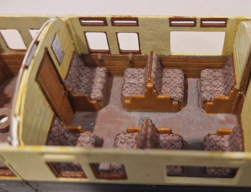 Just another point on the bay seating, I filed the thin moulding down on the top of the seat backs so that I could run the pattern over the top and down the other side, so covering both sides of the back to back seating with one pattered piece. I then replaced the moulding with a half round length of micro strip, painted brown first. Adopting this method avoids any unsightly raw cut paper edges at the tops of the seat back.