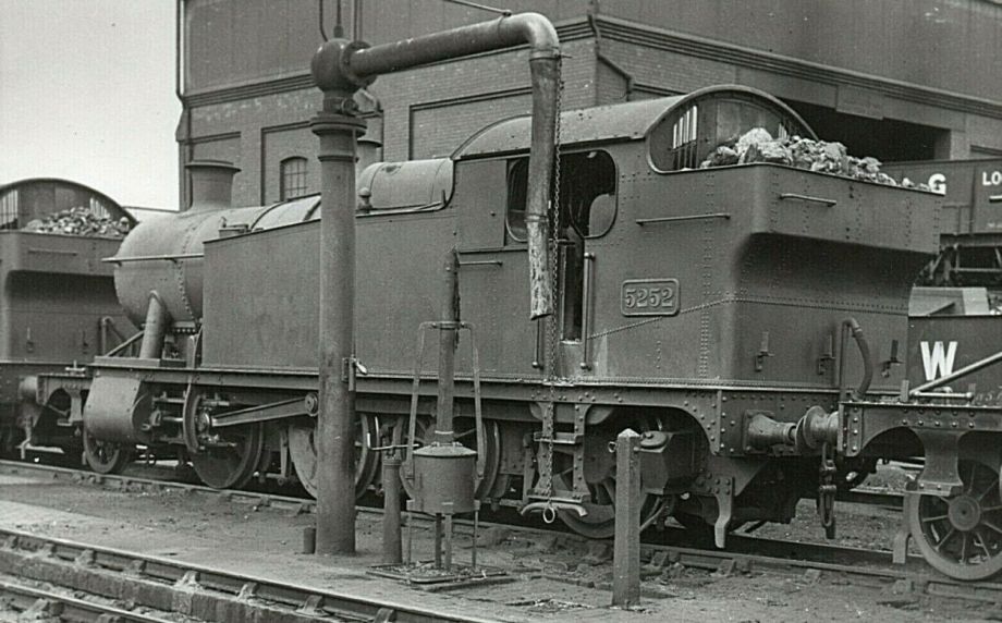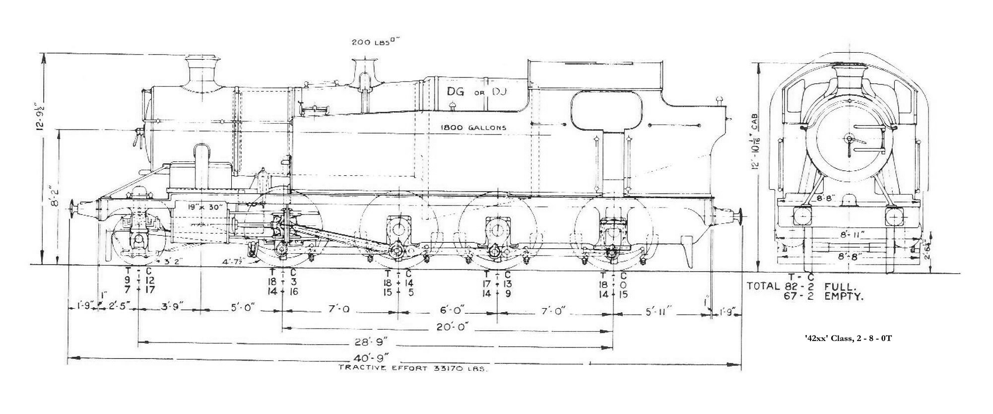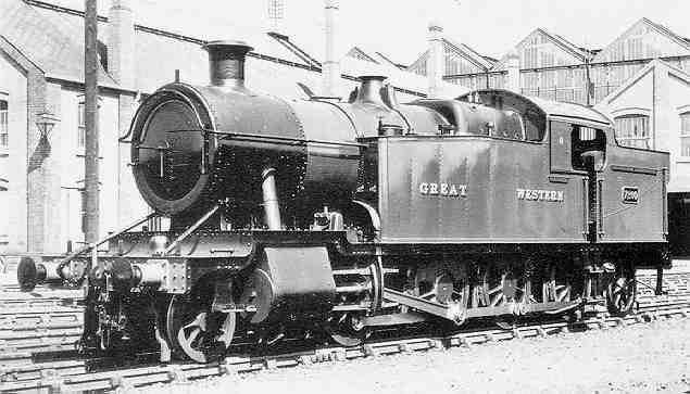 * yes both, first square in 1931 and later the curved style In common with many other Churchward classes, the cylinder piston axis was 2½" above the driving axle datum, for both the original build state and those built with raised footplate sections. Tank capacity was 1800g, and coal capacity was 4 tons. Sliding shutters were fitted to the cabs to all between 1931 and 1936. The recess to the bunker was fitted to all between 1934 and 1946 and from 1938 a fender was added to the recess. It would appear that the rear bunker hand-rail was fitted only to the near side prior to the fitting of the recess after which it was on both sides. From 1939, handrails were fitted to the front tank strap bridging the boiler at front end of the water tanks. The smokebox top lampiron was moved to the smokebox door on all during the 1940s including the 72xx class. The steam lance cock on the smokebox front was in the 8 o'clock position, which was usual for a Swindon No 4 boiler, but some locos had the cock in the 4 o'clock position. Because boilers moved moved around the various engines so fitted, quoting numbers is possibly a slightly pointless exercise but some 4 o'clock instances are: 4258 in 1917; 5243 in 1924: 4232 ??; 4208, 1939: 4278, 1939. In February 1960, 4257 was photographed at Swindon with a Code DL boiler and the chimney set forward. 7249 was photographed at Seven Tunnel Junction in September 1964 with a similar boiler. Collett taper buffers start appearing on 42xx locos in the mid-1930s and there are several photos showing these dated 1936–8. The Collett parallel buffers also start to appear regularly on 42xx locos in the mid-1930s, although 4297 had them by May 1929. Most 42xx and 5205 engines appear to have acquired the parallel buffers by the early post-war years. The Collett parallel type of buffer spread throughout these and the 72xx classes during the 1940s. Concerning the routing of the water feed to the topfeeds, most photos of 42xxs where the pipes are visible show them curving back along the tank top. This includes photos in BR days. It seems unlikely they were altered. Some locos initially fitted with tall safety valves bonnets, i.e. up to 5274, acquired short safety valve bonnets at various times. Many tall bonnets survived into BR days. A mushroom vent appears to have been fitted at the rear of the bunker tank on early builds just to the off-side of centre, on later builds the tank vent was an inverted 'U' behind cab on the off side. Photographs exist of mushroom vents on 4253 in July 1950 and 5202 July 1938 and of the 'U' type on 5289 in the early 1930s (1934?) whilst in store prior to rebuilding. Vacuum pipes on the rear buffer beam were sometimes to the left of the coupling hook and sometimes to the right. Great Western power classification and route restriction: E, Red. BR power class 4200–5204 7F; 5205–5264 8F (presumably although not stated this would also apply to those re-cylindered!) The 2-8-2Ts These were not new builds, all being rebuilt from 2-8-0Ts many of which due to the Depression, were in store.